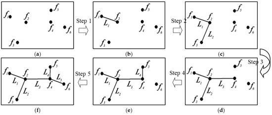 Taking the risk sources f1–f6 in Figure 3a as an example, the risk source minimum spanning tree was constructed from the risk source f1. The construction process and results are shown in Figure 3 and Table 1, whereas the minimum spanning tree of risk source constructed is shown in Figure 4.