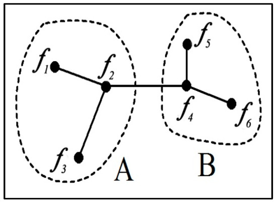 By comparing the various path distances in Table 1 to the distance threshold 2 km, it was observed that the paths L2 and L3 were both greater than the distance threshold. However, the nodal distance ratio of paths L2 to L1 (node path with the largest nodal distance from L2) was 1.14, while the nodal distance of L1 was 1.89, which was less than the distance threshold. Thus, L2 did not satisfy Equation (3), and only path L3 satisfied the interrupt condition. Through interrupting path L3, two sub-regions could be obtained, of which risk sources f1–f3 were partitioned into a sub-region A, and risk sources f4–f6 were partitioned into another sub-region B. The specific partitioning results are shown in Figure 4.