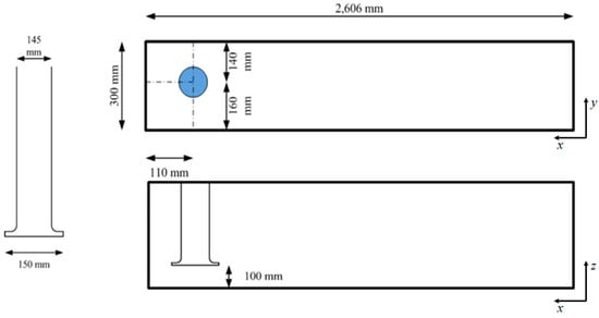 The adopted model was applied to a benchmark test case for validation. Okamura et al. [10] experimentally investigated the generation of a stationary surface vortex, non-stationary surface vortex, and stationary subsurface vortex. The width of the channel was 300 mm, the suction pipe diameter was 145 mm, and the inlet was installed 100 mm from the bottom of the channel and 110 mm from the back wall. The center of the suction pipe was shifted 10 mm from the central line of the channel to produce a nonhomogeneous flow. The water level was 230 mm, and the output was 1.0 m3/min (Figure 1).
