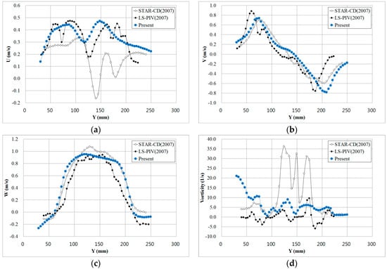 CFX results obtained in the present and previous research: (a) x-directional velocity results; (b) y-directional velocity results; (c) z-directional velocity results; and (d) vorticity results.