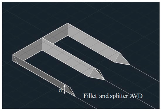 The splitter and fillets attached to the floor under the bell mouth are the typical AVD for reducing the vortices and pre-swirls in the pump sump. Figure 3 shows the AVD adopted in this study. This AVD has a bottom splitter to improve the flow characteristics near the bell mouth and side wall corner fillets to reduce the side wall vortices and swirls. The slope of each splitter and fillet is 45°, and its length from the back wall is 110 m. The effective height of the AVD was determined on the basis of the results of the numerical tests.