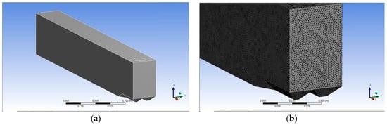 To determine the effective height of the splitter/fillet AVD, the additional flow conditions described in Table 1 were considered. The adopted AVD heights were set according to the ratio to the bell mouth diameter in the range 0.1–0.4. The flow depth range was 0.15–0.30 m with 0.05 m increments. Figure 4 describes the numerical domain and mesh for the numerical simulation that was created using the ANSYS meshing tool with mesh size criteria (edge size) of 2–5 mm.