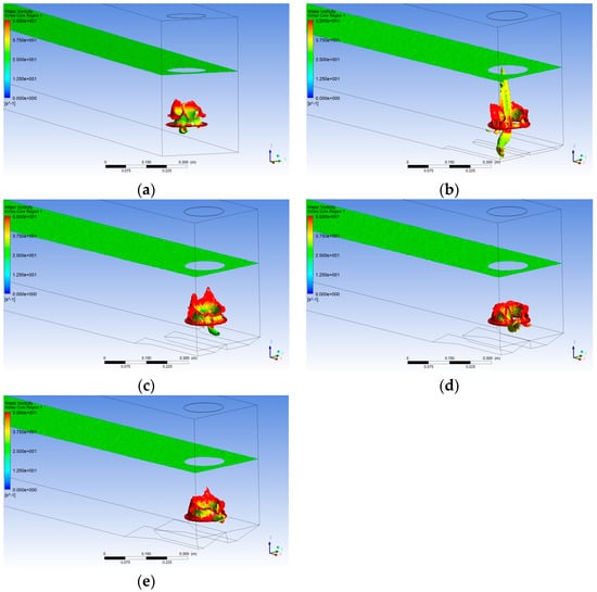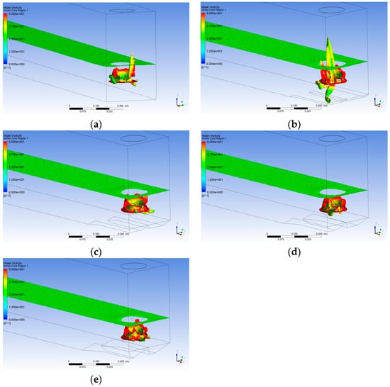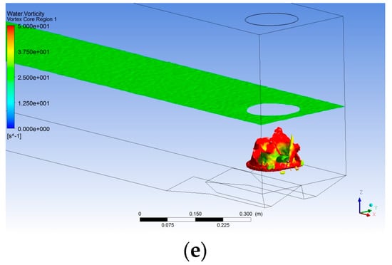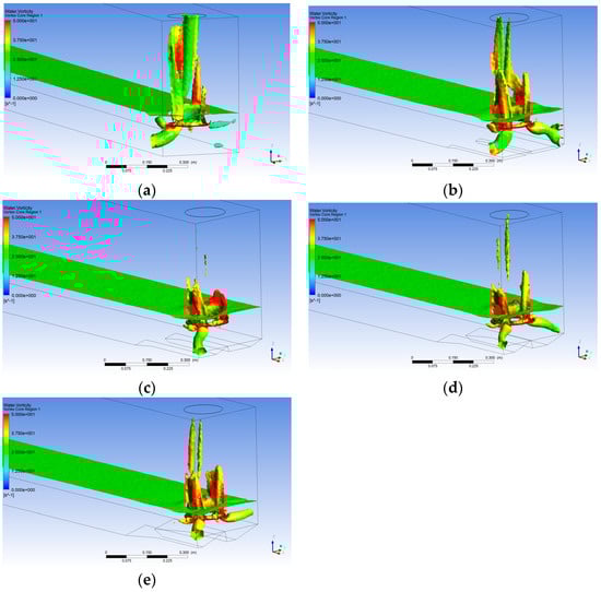 Comparison of calculated vortex regions under inflow depth is 0.30 m with changes in AVD height: (a) without AVD; (b) AVD height d = 0.1D; (c) AVD height d = 0.2D; (d) AVD height d = 0.3D; and (e) AVD height d = 0.4D.