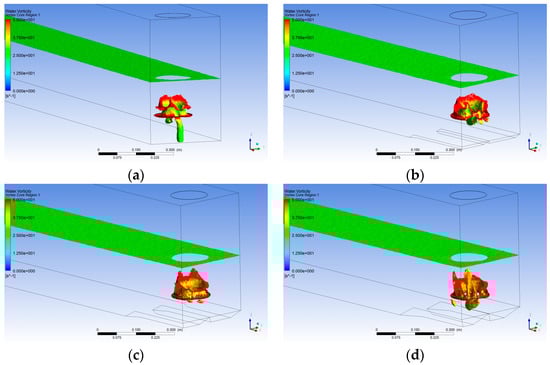 To analyze the effectiveness of AVD in the pump sump, the change in the flow characteristics of the quantitative and qualitative methods were compared. The vortex core was visualized and compared to illustrate the danger area (i.e., the area with high strength vorticity). A vortex can be defined as either a region or a line. Generally, line-based algorithms provide more compact representations of vortices and can easily distinguish between individual vortices in close proximity [18]. In this study, the helicity method reported by Levy et al. [19] was adopted to analyze the vorticity in the pump sump. Figure 5 shows the analyzed vortex zones under different AVD height conditions in a pump sump with an inflow depth of 0.15 m. The vortex core developed the near channel wall and affected flow in the outlet pipe. However, with variation in AVD height, the formed vortex region changed. The vortex region was minimized for AVD height d = 0.2D under the 0.15-m inflow depth condition. With further increase in AVD height, the vortex region becomes larger (Figure 6, Figure 7 and Figure 8).