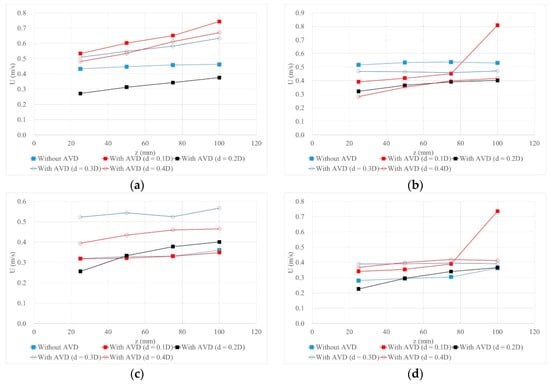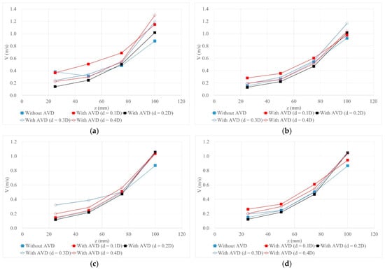 As shown in Figure 10c, the installation of AVD did not make a significant difference in velocity calculations, except in the case of AVD height of d = 0.3D in the region of z-direction from 25 mm to 75 mm. However, it showed increased velocity calculation results near the bell mouth in all AVD installation cases. Figure 10d shows a comparison of the numerical results of y-directional velocity with the deepest inflow depth of H = 0.30 m. It was observed that the AVD installation causes a slight velocity increase from z = 25 mm to 75 mm, except in the case of AVD height d = 0.2D. The maximum velocity increase was observed in the case of AVD height d = 0.1D. In all AVD installation cases, a velocity increase was observed on the bell mouth height. In the numerical results comparisons of the y-directional velocity change, the velocity was observed to increase owing to AVD installation around the bell mouth height. It is surmised that the velocity decrease by AVD installation cannot be expected in all areas in the pump sump, and unexpected flow velocity increase may occur near the bell mouth.