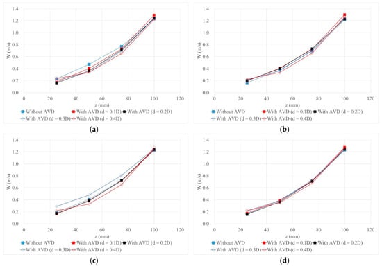 Figure 11 shows a comparison of z-directional velocity changes by AVD installation. Figure 11a shows the numerical simulation results with the lowest inflow depth of H = 0.15 m. In the overall cases with AVD installations, only a slight decrease in velocity was observed. The velocity decrease was distinctly observed between z = 50 mm and 75 mm areas. Very similar velocity calculation results were observed near the bell mouth height, but little velocity increase is expected with an installation of AVD height d = 0.1D. Figure 11b depicts the numerical results of the z-directional velocity with an inflow depth of H = 0.20 m. In all of the cases, no significant velocity change was observed. This means that AVD installation cannot affect the z-directional velocity in all cases. Figure 11c shows the comparison of maximum z-directional velocity on the comparison lines with an inflow depth of H = 0.25 m. In the cases of the AVD height d = 0.1D and 0.2D, no significant velocity changes were observed by numerical simulations. However, velocity increase was observed for the installation of the 0.3D height AVD, and a velocity decrease was observed for the installation of the 0.4D height AVD. The velocity change is evident between z = 50 mm and 75 mm, similar to the results of the case with an inflow depth H = 0.15 m. It can be surmised that the most effective area for the decrease in the z-directional velocity owing to AVD installation is the middle region of the bell mouth and channel bottom. Figure 11d shows the numerical results with the deepest inflow depth of H = 0.30 m. No significant flow velocity changes could be observed in this case.