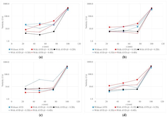 Comparison of calculated vorticities with changing inflow depths and AVD heights: (a) inflow depth H = 0.15 m; (b) inflow depth H = 0.20 m; (c) inflow depth H = 0.25 m; and (d) inflow depth H = 0.30 m