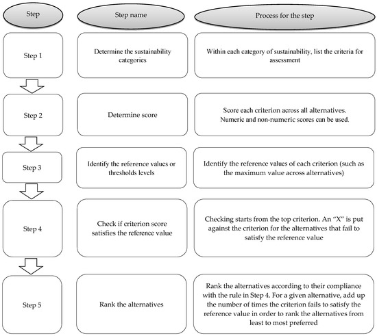 The flow chart in Figure 1 explains the major steps used by the authors to rank the alternatives in their research, as illustrated by the case study in Section 2.2, Section 3 and Section 4. As can be seen, five main steps are utilized to order the alternatives according to preference, from most to least preferred. In fact, the procedures displayed in Figure 1 constitute a special case of the overall elimination approach [32], which is explained in detail by Ma et al. [32]. In Step 4 of the current case study, shown in Figure 1, the highest criterion values of the agricultural systems are considered as reference values, to which the other values of the criteria of the agricultural systems are compared. The reference value represents the highest achievable value in this data set for a given criterion. The scores of the criteria are developed in such a way that the highest value of the criteria represents a higher level of sustainability. Therefore, all of the highest scores of the criteria of different agricultural systems are considered as reference values for the respective criteria. If the criterion value is equal to the reference value, the agricultural system fulfills the criterion. This new rule can be considered as an addition to the overall Elimination Method, that makes it easier to use in sustainability assessment. The total number of criteria fulfilled for each sustainability criterion determines the rank for each agricultural system.