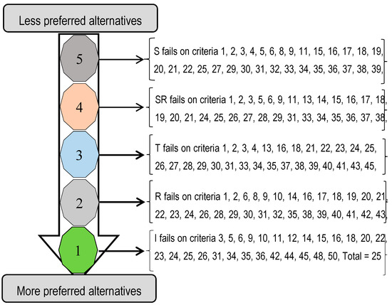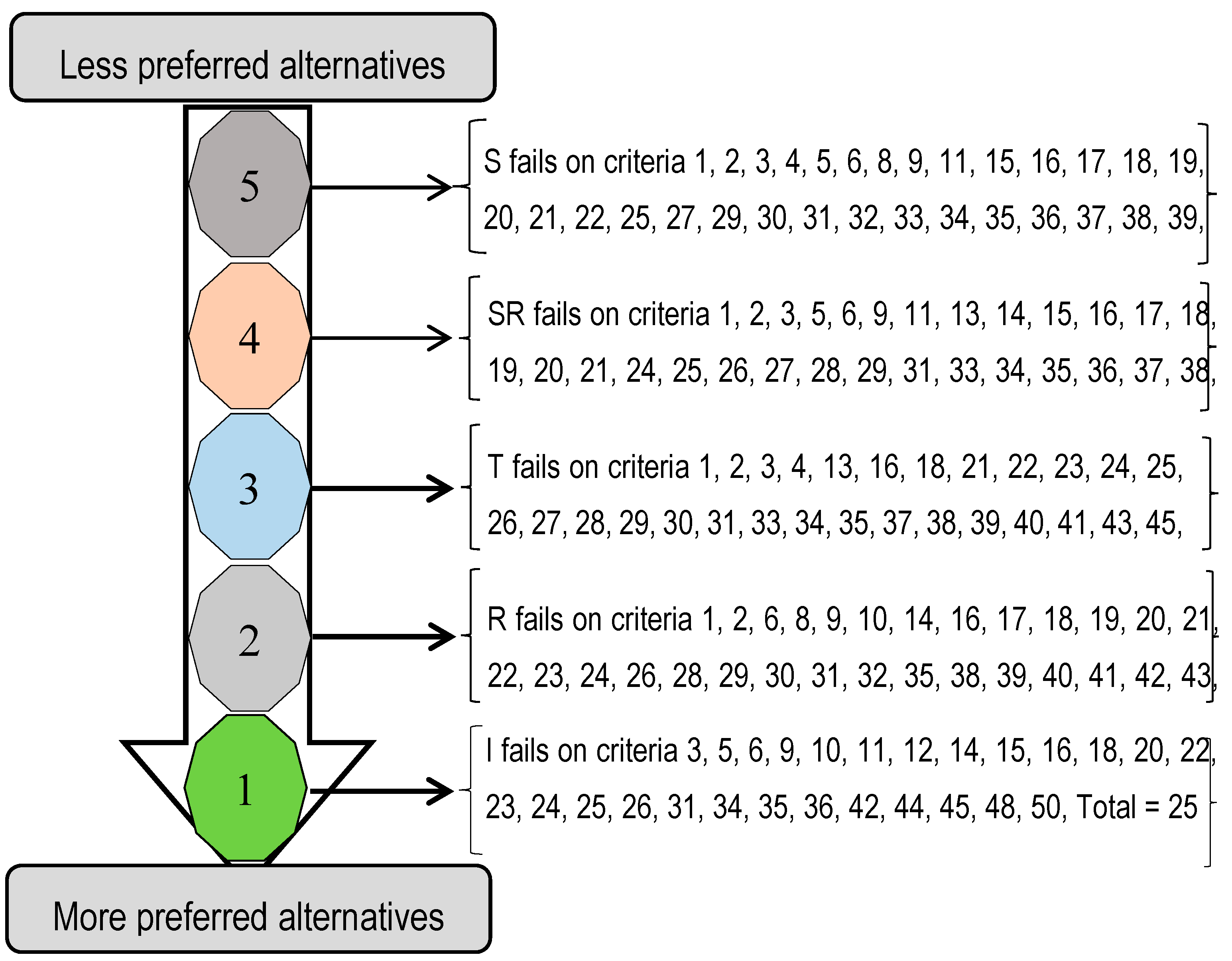 In Step 3, let be the maximum value of criterion , across all of the alternatives. Here, is referred to as the reference value for criterion . In this application, the maximum value is used, but in other situations it may be meaningful to use a reference value such as the mean or minimum value. If the value of an alternative for criterion is less than , then an “X” is assigned to indicate that the alternative is below the reference value for . As can be seen in Step 4, one does this for every criterion over all of the alternatives. In Step 5, the total number of times that an alternative fails to meet the reference value across all of the criteria, is used to rank the alternatives, where ties are allowed.