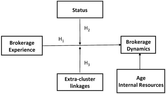 Collocation favors pervasive interactions and densely knitted networks. On the other side of the coin, extra-cluster relationships with distant partners are conceived as loose social architectures providing non-redundant knowledge [17]. But for many firms, particularly SMEs, the creation of these relationships means overcoming traditional weaknesses in non-local network creation by accumulating knowledge and experiences to develop alternative forms of cooperation, adjusting the strategic objectives to common goals in non-local networks, considering the compatibility of local operations with non-local linkages, evaluating cultural barriers, etc. [66]. The cost and effort devoted to distant cooperation affect investment in local networking. Brokers should constantly readjust resources and devote additional effort to forging external relationships. Therefore, in line with recent evidence [67,68], the hypothesis may be made that: