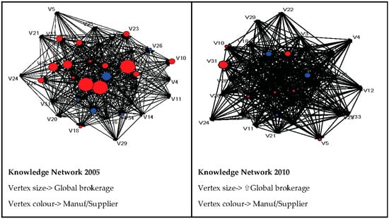 As Table 2 shows, a comparative analysis of the values of the knowledge network at both moments in time raises a few questions. Over time, the network governing the exchange of knowledge within the cluster has become denser, and dyadic reciprocity has improved. This suggests that the network has evolved to become a more interconnected structure with a more dynamic flow of knowledge. However, transitivity remained unaltered during the same period, perhaps because variation of brokerage activity in some firms has been offset by opposite changes in others.