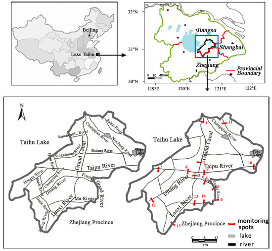 Wujiang District is located in the south of Jiangsu Province. It also neighbors two other highly developed areas, Zhejiang province and Shanghai Municipality (Figure 1). The total population for this district is over 1.2 million. Wujiang currently ranks as one of the most economically successful cities in China and the major industries include electronics, printing and dyeing, and textile manufacturing, which produce large amounts of sewage. The surface water area of Wujiang District is approximately 267.1 km2, accounting for 22.7% of the total area. The river networks in this district are mainly composed by three rivers: Taipu River, Grand River, and Lanxi River (Figure 1). The Taipu river flows easterly into Shanghai and the other two rivers flow southward into Zhejiang province [12,13].