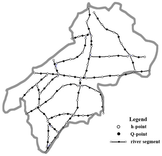 The 1-D plain river network model for Wujiang District included 19 river segments in total, with a length from 8.2 km to 39.6 km. The dimensions for each segment was obtained from Wujiang Environmental Monitoring Center and were correctly implemented into the model as geometry data. The model consisted of 104 h-points and 65 Q-points (Figure 3). Surface elevation and water quality (e.g., CODCr and NH3-N) parameters were predicted on h-points while river discharge was simulated on Q-points. The model time step was set as 60 s, considering the model stability and calculation efficiency. Measured river discharge data at the boundary node was used to drive the model. An emission source in the study area was added at the nearest node point as external nutrient loading. Model calibration was conducted with field data in March 2013, while the validation of the model was done through comparing with the field measurement in April 2014.
