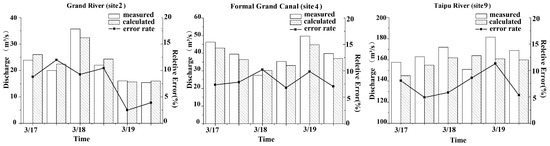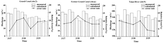 Field hydrology data were obtained from 17 to 19 March 2013 in Wujiang District. The canal roughness of the river networks in Wujiang District was calibrated in a range of 0.023–0.032. According to the study of the river networks in the lower reach of the Yangtze River of China by Han et al. the bottom roughness for this area was estimated between 0.019 and 0.031 [22] and, hence, our calibrated roughness was completely reasonable. As is shown in Figure 4, the simulated values were close to the measured ones at river segment 2, 4, and 9. Relative errors for discharge at these three sites were between 3.9% and 18.2%. Average errors for the entire river networks was 12%.