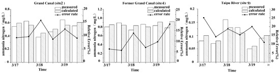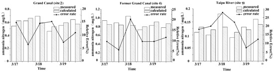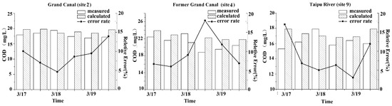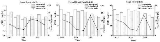 The water quality results between the model and field observations are shown in Figure 8 and Figure 9. It was noted that the model-predicted results matched well with the measured ones, with relative errors between 3.2% and 16%. The average relative error for the entire river networks was 9.2%, which indicated that the transport process of pollution could be well represented by our model as well.