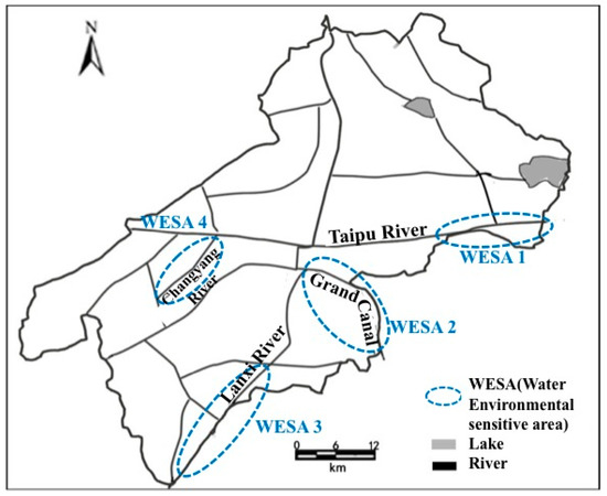 The concept of environmentally sensitive areas (ESAs) was first proposed in 2008. According to the “Environmental Impact Assessment of Construction Project and Classification Management List” [11], ESAs include many different types of natural and cultural protection areas, as well as some important functional areas, which are particularly sensitive to some types of contaminants or ecological impacts. In recent research of the Taihu Basin river networks, water environmentally sensitive areas (WESAs) refer to special river areas, including all of the river protection zones proposed by officials and key river segments with important ecological and water quality functions.
