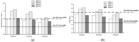 Comparison of average water quality in sensitive areas under different conditions. (a) CODCr; (b) NH3-N.