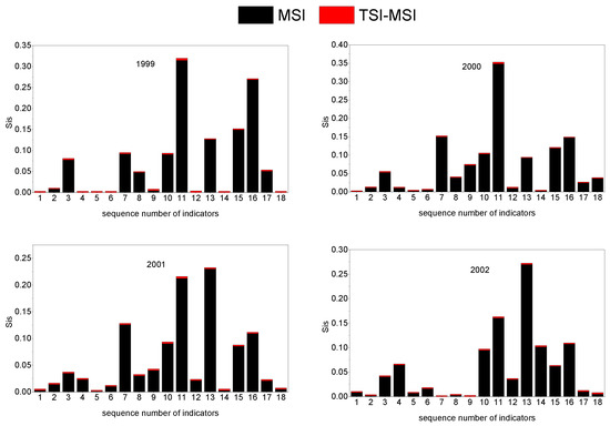 The TSI contains the model output variance contributed by both the individual indicator and the coupled indicators. More importantly, the TSI more fully reflects the importance of the indicators for the objective function. To make the weights more comprehensive, we needed to add the coupling effects into the weight determination. Hence, we chose the TSI to act as the basis of the weight determination.
