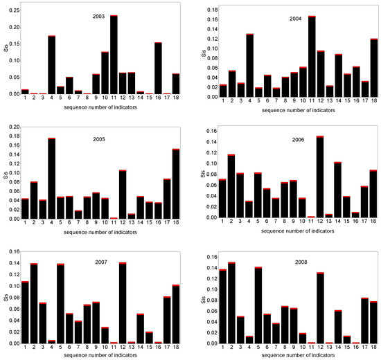 As shown in Figure 1, the MSI of each indicator is slightly less than the TSI. The red bars show the effects of indicator interaction and suggest that a certain degree of coupling exists among the indicators. The value of the coupling effect is calculated to be within a range of 0.002–0.005. Although the effect is small, it cannot be neglected when accurately calculating the degree of influence of the indicator on the model output. Therefore, the TSI of each indicator in different stages is specifically analyzed.