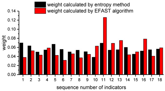 Based on the results of the sensitivity analysis of EFAST, we can easily obtain the weights determined by the EFAST. Figure 2 shows the comparison of indicators’ weights determined by EFAST and entropy, respectively. Here, we only analyze the weights fixed by the EFAST method. The differences between these two methods will be discussed in the next section. The top five indicators in the EFAST method, representing a total proportion of 41.1%, are forest coverage, chemical fertilizer application rate assuming 100% utilization, improvement rate of soil and water loss and arable land per capita, and the weights are 0.126, 0.078, 0.075, 0.078 and 0.075, respectively. These top five indicators include the ecology, resources and environment indicators. These five indicators fully reflect that on which we focus. Additionally, the weights of the remaining indicators are between 0.015 and 0.06, which might have a weak influence on the evaluation result. By comparing with the results obtained by the entropy method, which has been commonly recognized [30,31,32], we show that the two methods exhibit high similarities. Thus, we can conclude that the EFAST algorithm is able to effectively recognize the importance of the indicators.