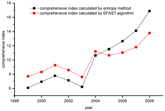 The advantages of The EFAST method can be summarized as following. Firstly, the analysis of indicator weight by the EFAST algorithm is based on nearly ten thousand samples, and this method adds the coupling effects among the indicators through a quantitative calculation into consideration. Therefore, the EFAST method is more rational and comprehensive than the entropy method. Secondly, the weights assigned by the EFAST algorithm are more discrete than those of the entropy method, which reflects that the EFAST method can more efficiently separate the importance of the indicators. Lastly, but definitely not least, according to the results provided by the model, the comprehensive index calculated by the EFAST algorithm more effectively and accurately reflects the actual changes in agricultural sustainable development evaluations.