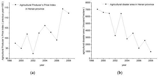 Agricultural producer’s price index and agricultural disaster area in Henan during 1999–2008. (a) Agricultural producer’s price index of 1999–2008 in Henan; (b) agricultural disaster area of 1999–2008 in Henan.