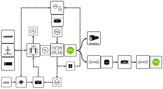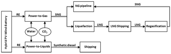 The hybrid PV–Wind-(PtG, PtG–LNG, and PtL) value chain (very simplified).