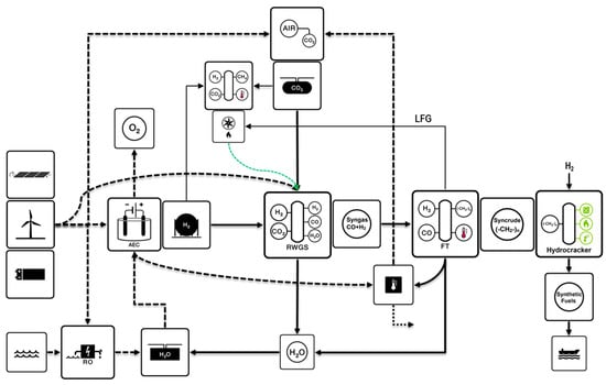 Figure 6 illustrates the energy and mass flow for the PtL value chain. As can be seen, the alkaline electrolyser, at 93%, is the main electricity consuming element, while the excess heat by-product of the electrolyser and the FT plant is the main source of energy for the CO2 capture plant. The heat released in the FT process accounts for 18% of initial electricity and 22.5% of energy content of inlet H2 to the system. The electricity generated by LFG combustion is equal to 1.7% of the inlet electricity. The overall PtL efficiency of this system would be 51.5% (HHV), while 64.9% of inlet hydrogen is converted to liquid fuels in the H2tL plant.