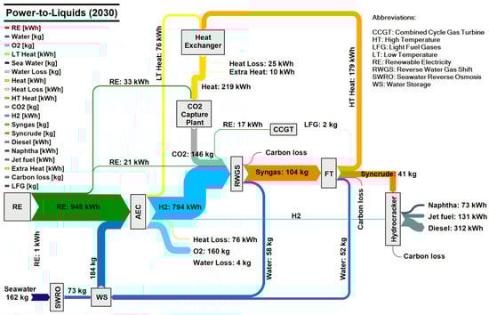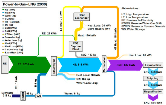Figure 5 and Figure 6 show the Sankey diagrams of the entire system, depicting the energy and material flows within the entire RE-PtG–LNG and RE-PtL value chains, respectively. The figures are the example of a system with 1 MWhel specific electricity input. As can be seen in Figure 5, the electrolyser, at 97%, is the main electricity consumer in the PtG–LNG value chain, while the excess heat out of the electrolyser and the methanation plant is the main source of energy for the CO2 capture plant. Delivered SNG (HHV) to the NG pipeline in Southern Europe or regasified SNG (through LNG value chain) to Northern Europe (Finland) would be 63.7% and 57.4% of inlet electricity, respectively.