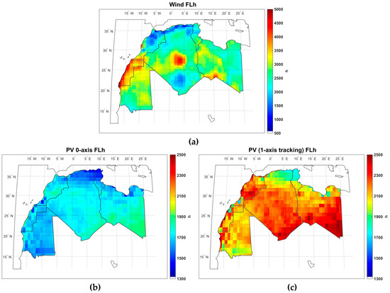 Wind FLh (a); PV fixed tilted FLh (b); and PV single-axis tracking FLh (c).