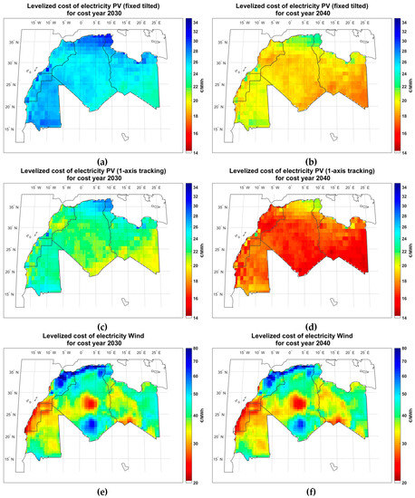 LCOE of fixed tilted PV in 2030 (a) and 2040 (b); single-axis tracking PV in 2030 (c) and 2040 (d); and wind in 2030 (e) and 2040 (f).