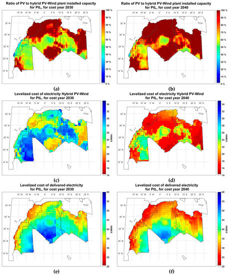 Ratio of PV to hybrid PV–Wind plant installed capacity in 2030 (a) and 2040 (b); hybrid PV–Wind LCOE in 2030 (c) and 2040 (d); and levelized cost of delivered electricity in 2030 (e) and 2040 (f); for the PtL system.