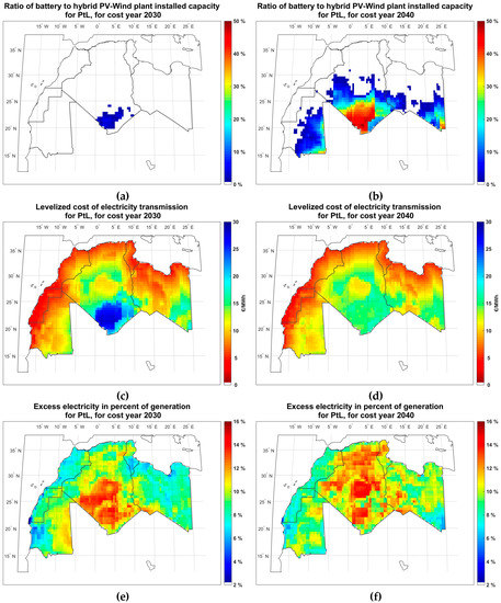 Ratio of battery to hybrid PV–Wind power plant installed capacity in 2030 (a) and 2040 (b); LCOE transmission in 2030 (c) and 2040 (d); excess electricity in percentage of generation in 2030 (e) and 2040 (f); for the PtL system.