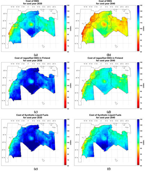 Besides FLh, the LCOE has a key role in the cost of synthetic fuels. Figure 8 shows the Maghreb region’s electricity production cost of fixed tilted and single-axis tracking PV systems and wind energy in 2030 and 2040. The minimum production cost of single-axis tracking PV in 2030 would be 20 €/MWh, which would drop down to about 15 €/MWh in 2040, and would be cheaper than fixed tilted PV. The minimum wind electricity generation cost with 2030 technology would be 22–25 €/MWh, but, unlike PV, it is limited to Western Sahara and Central Algeria.
