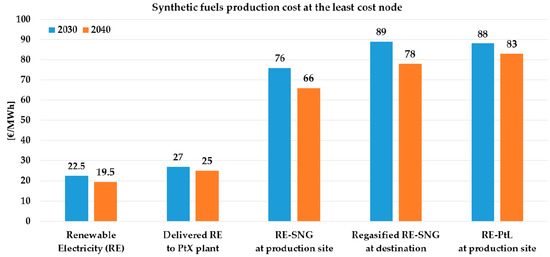RE and synthetic fuels production cost (based on HHV) at the least cost node for the base scenario in 2030 and 2040.