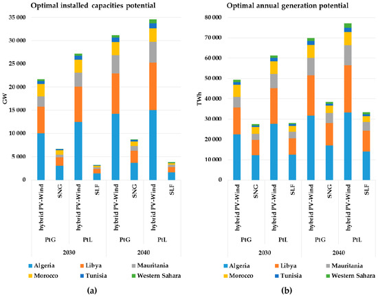 Optimal installed capacity (a) and production (b) potential of hybrid PV–Wind, PtG and PtL plants.