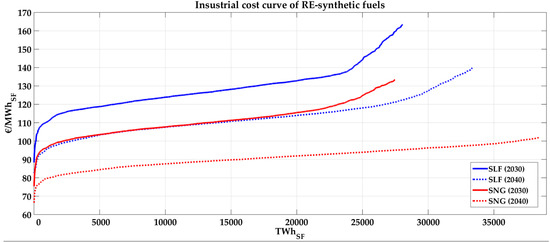 PtG (SNG) and PtL (SLF) industrial cost curves for cost optimized production based on hybrid PV–Wind power in a cumulative distribution, in 2030 and 2040.