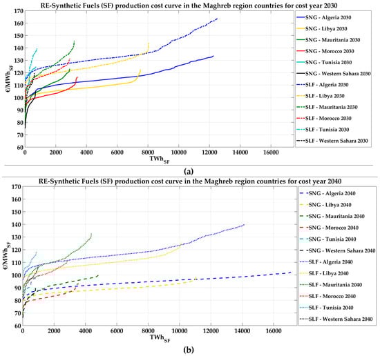 PtG (SNG) and PtL (SLF) industrial cost curves for cost optimized production based on hybrid PV–Wind power in a cumulative distribution for each country in the Maghreb region; in 2030 (a) and 2040 (b).