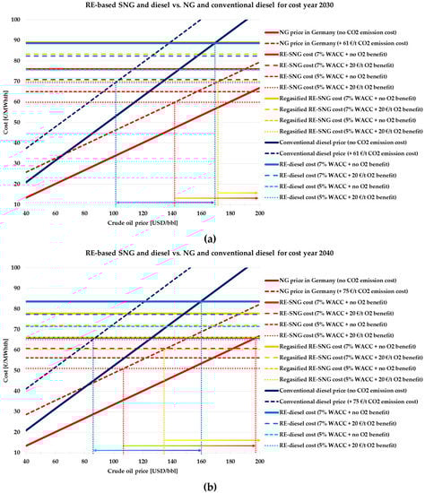As discussed in the introduction, by 2030 there would be countries that may only demand carbon neutral hydrocarbons, i.e., fossil-based fuels would not be accepted anymore in those countries. However, in general the RE-SNG and RE-diesel should compete with NG, LNG and conventional diesel in the market, which is a function of the crude oil price and in the case of diesel, also a function of refining cost. The 32-year average ratio of NG price in Germany (as a European country) to crude oil price is 77.9% [9,48]. In addition, for the latest six-year average, the NG price in Germany has been at the same level as the Spanish LNG price [49,50]. The 13-year average ratio of one barrel of diesel cost to crude oil price is 118.8% [10,51]. With current crude oil prices and the projected costs of synthetic fuels in 2030 and 2040 for the base scenario, synthetic fuels would not become comparable. However, an increase in crude oil price or CO2 emission cost will increase the cost of NG and conventional diesel, while a profitable business case for O2 or a feasible business case at a de-risked 5% WACC level can lead to lower cost for RE-synthetic fuels. In this study, according to Bloomberg New Energy Outlook 2015 [52], the additional cost of CO2 emissions on conventional hydrocarbons with a maximum price of 61 €/tCO2 in 2030 and 75 €/tCO2 in 2040 has been taken into account. The market price of oxygen for industrial purposes can be up to 80 €/tO2 [8]. Nevertheless, the projection of a maximum 20 €/tO2 benefit from oxygen utilization is assumed in this study, while there is no benefit from oxygen utilization in the base scenario. The effects of all these factors have been summarized in Figure 16. The prices of NG and diesel in the EU are based on: