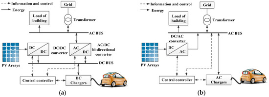 Typical structure of a PV-assisted charging station. (a) DC chargers; (b) AC chargers.