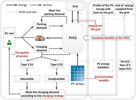 According to the statistics, the parking duration time of vehicles around office buildings is usually much longer than the charging time they need, which means that they do not need to be charged as soon as they arrive. Considering this fact, it is obvious that the combination of the parking and charging demands will produce a more effective mechanism. Hence, a typical operation mode for a commercialized PVCS is shown in Figure 2.