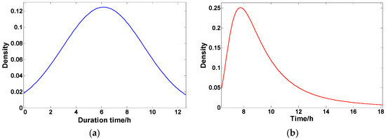 The probability density distribution of the parking duration time and arrival time is obtained, based on the statistical data relating to EVs around the office building. The fitting results are shown in Figure 4.