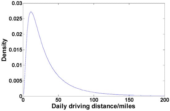 The EVs parked around the office building are mostly household vehicles. The daily driving distance of EVs in this paper is provided by the National Household Travel Survey (NHTS). The daily driving distance can be fitted to the following lognormal distribution [28,29], seen in Figure 5.