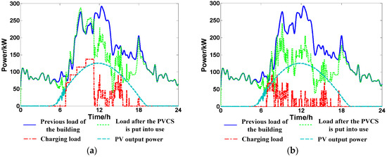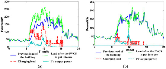 It can be seen from the results that the PVCS can satisfy most of the charging requirement with PV energy. Compared to the original load of the building, the charging activities of EVs do not have negative impacts on the grid. Furthermore, if the original peak load of the building appears at noon, when the PV output power is large, the peak load is reduced by the PVCS.