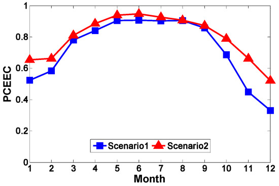 In scenario 1, the PCEEC is over 50% in ten months, and five of them are over 80%. The worst value still reaches 33%. In scenario 2, the PCEEC is over 50% all year. With the rapidly growing charging demand, the above proportions indicate that the PVCS will have a significant effect on environmental benefits.