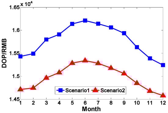 For scenario 1, during the months with abundant PV energy, the daily peak load is very close to the original load of building, as shown in Figure 10. Meanwhile, it can be seen from Figure 10 that most of the time during the year, the amount of energy supplied by the grid decreases because of the PVCS. This means that the charging activities have no severe impacts on the grid. For scenario 2, the peak load is close to the original load of building all year round, and the amount of energy supplied by the grid is also lower in every month. Both of the simulation results under the two scenarios indicate that the utilization of the PVCS can greatly reduce the negative impacts and dependence of EVs on the grid.