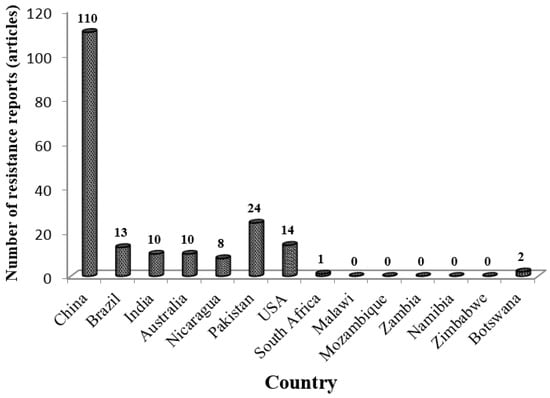 The DBM has shown resistance to 91 active ingredients of agricultural chemicals worldwide, including 12 strains of Bacillus thuringiensis (Bt), between 1953 and 2014 [48,69,70,71]. Compared to other parts of the world, DBM insecticide resistance in SA is relatively low (see Figure 1). Farmers tend to rely on their personal observation of insecticide efficacy failures to detect resistance. Following resistance ‘detection’, farmers usually continue using the same active ingredients at higher frequency, higher dosages, or in cocktails with other ‘powerful’ chemicals, which exacerbates the situation [5,42,43,60]. Despite the widespread use of hard chemicals to combat DBM in SA, we have not found any published comprehensive study on DBM resistance to commercially registered pesticides in this region (Figure 1). Management options and extension recommendations have been based on reports from the relatively advanced economies (China, Brazil, India, Australia, Nicaragua, Pakistan and USA) (Figure 1). However, resistance is highly geographical and highly correlated to insect strain as regards chemical exposure history, hence ‘foreign’ recommendations may not be directly applicable to the spatially heterogenous nature of the SA small-scale farming communities.