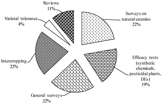 In contrast, the other SA countries have limited research on DBM, with Zimbabwe being the only country contributing just over 10% of DBM research. Most of the DBM research is conducted by incapacitated horticultural research institutions that are often poorly funded [24]. The bulk of the research was survey-based, covering general farmer practices, identification, and spatio-temporal distribution of the DBM natural enemies (Figure 4). These surveys brought about vast knowledge on DBM predation and parasitism rates in the region [5,19,22,77]. Crop systems approached through intercropping with mustard, Brassica juncea (L) (Czern); onion, Allium cepa (L.); and/or garlic, Allium sativum (L.) (also making 22% (Figure 4)), have been over studied and duplicated in many SA counties, due to a lack of research coordination and information sharing [12,78,79].