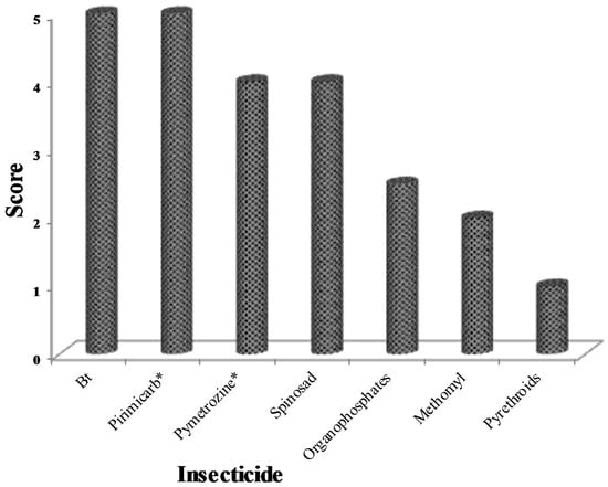 According to Walsh [84], Bt-based insecticides and Pirimicarb are the softest pesticides on DMB natural enemies, followed by Pymetrozine and Spinosad (Figure 5). Organophosphates, methomyl (a carbamate), and synthetic pyrethroids have high negative effects, particularly on Trichograma sp. and Cotesia sp., the most abundant and efficacious parasitoid species in SA [73,84,85]. Ironically survey results from SA, particularly Botswana [20], Zimbabwe [22], Malawi, Zambia [40], and Mozambique [5], show that synthetic pyrethroids, organophosphates, and carbamates are among the most commonly used insecticides in vegetable production. However, since genetically modified (Bt) brassicas were not accepted in SA due to social and environmental concerns [25], one of the sustainable management options is the rotation of Bt-based insecticides.