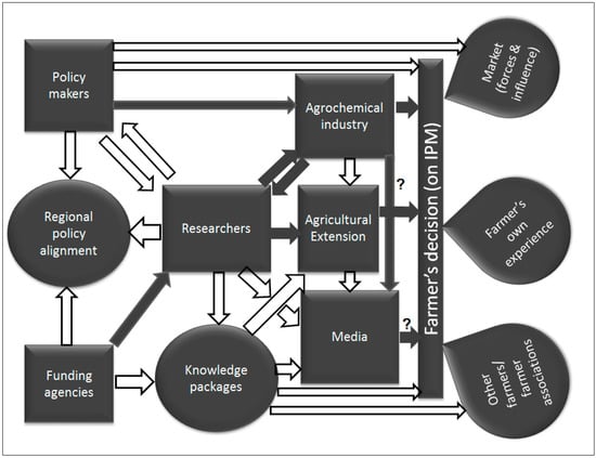 Perceived conceptual framework of links and information flow in DBM research in Southern Africa. The currently existing framework (solid arrows), the proposed framework (blank arrows), new suggested structures (circles), and links with both positive and negative influence on farmers’ decision making (?) (Authors’ own construction).